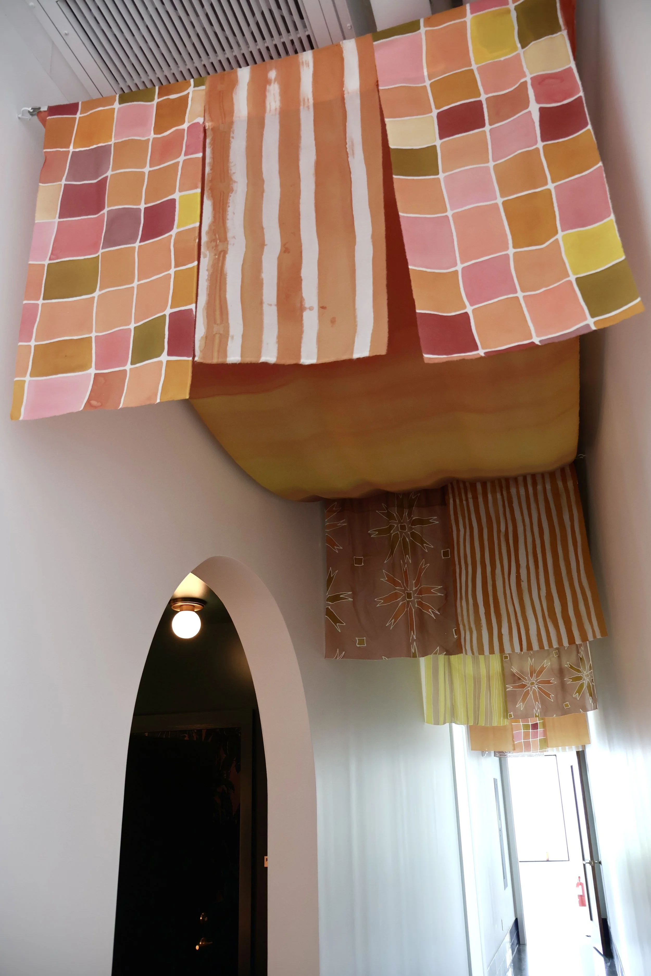 Suspended above the walkway between dining rooms, Haley Nannig’s silk installation turns movement into memory. Inspired by the cheerful, candy-colored beach tents that once dotted Portugal’s coastlines — from Cascais to Comporta — the piece uses patterned silk panels in bold stripes and delicate hues to recall a certain kind of seaside joy: nostalgic, playful, unmistakably Portuguese.